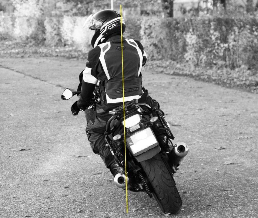 Zorg dat je met je lichaam niet buiten het zwaartepunt van je motor gaat hangen, maar houd je gewicht erboven. Doe je dat niet, dan kun je vallen. Denk maar aan een keukentrapje. Zolang je zelf in een rechte lijn met het trapje blijft, dan val je niet om. Hang je naar de zijkant, dan val je ervan af. Zorg dus dat je, als je op de motor zit, je lichaamsgewicht recht boven je motor houdt.