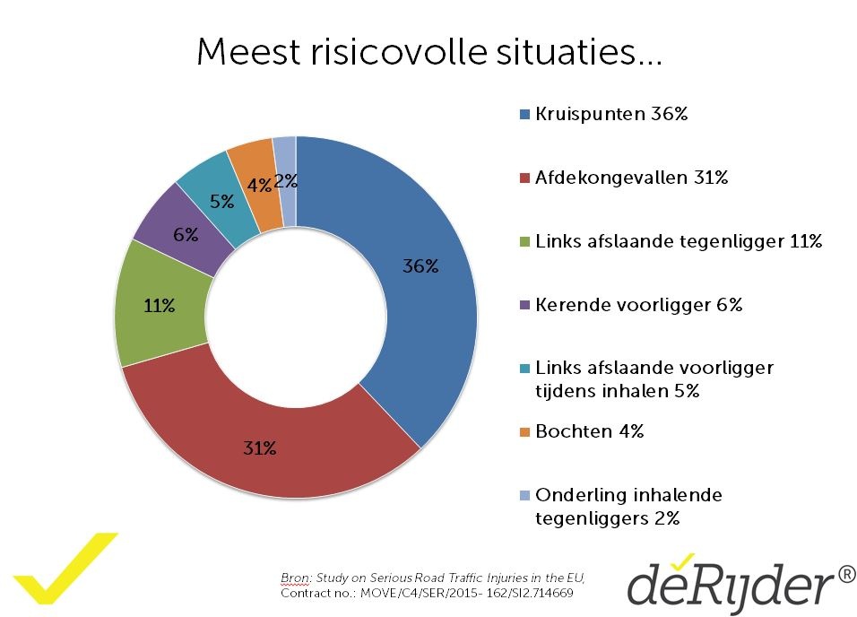 Het meest risicovol voor motorrijders is het kruisend verkeer. Zeker 83% van de ongelukken heeft hier mee te maken! Splitsingen en kruispunten vormen de grootste risico´s, hier gebeuren de meeste ongelukken (36%). In 75% van de gevallen gebeuren ongelukken met verkeer van rechts, en 25% van de gevallen van links.
