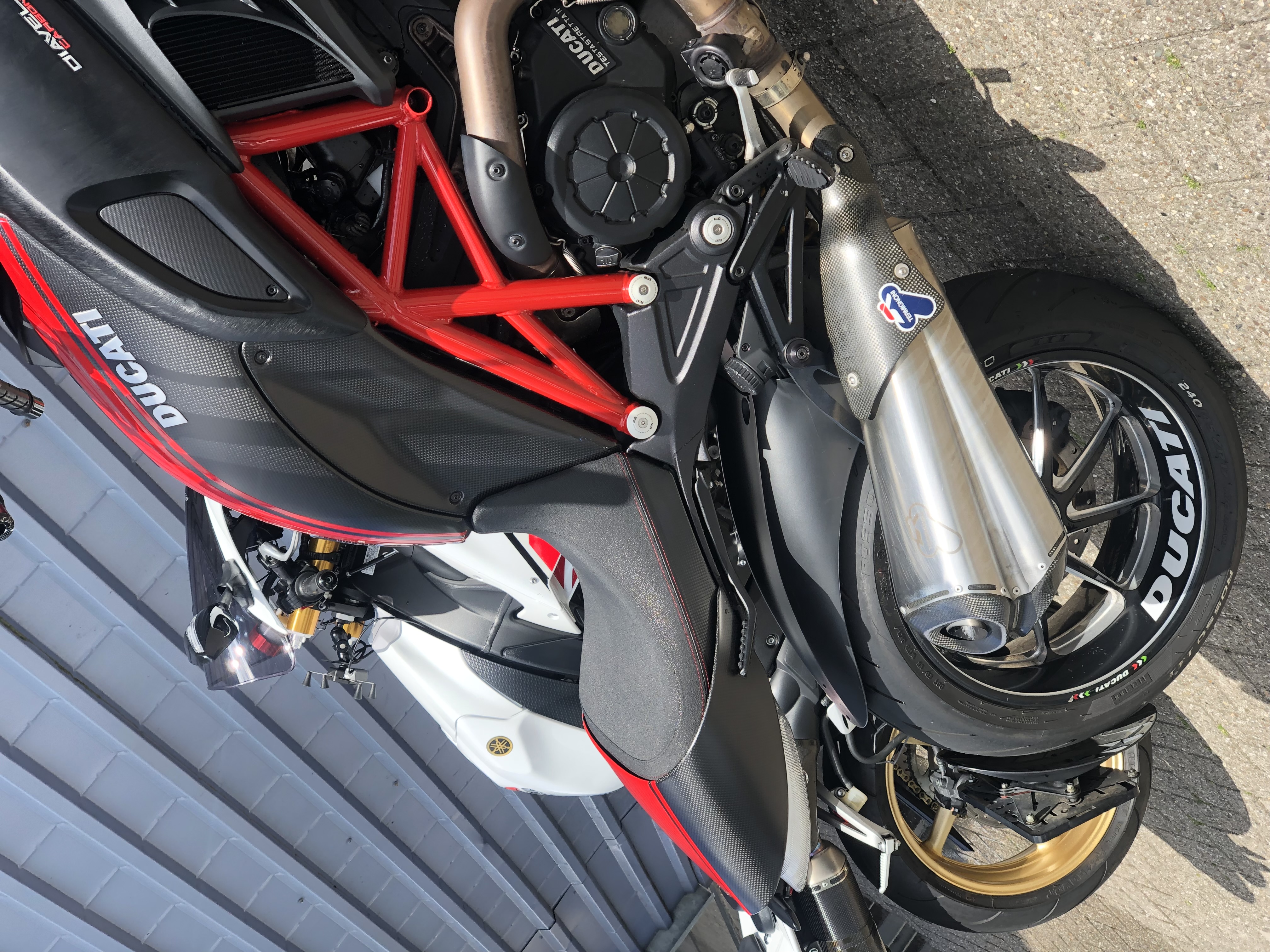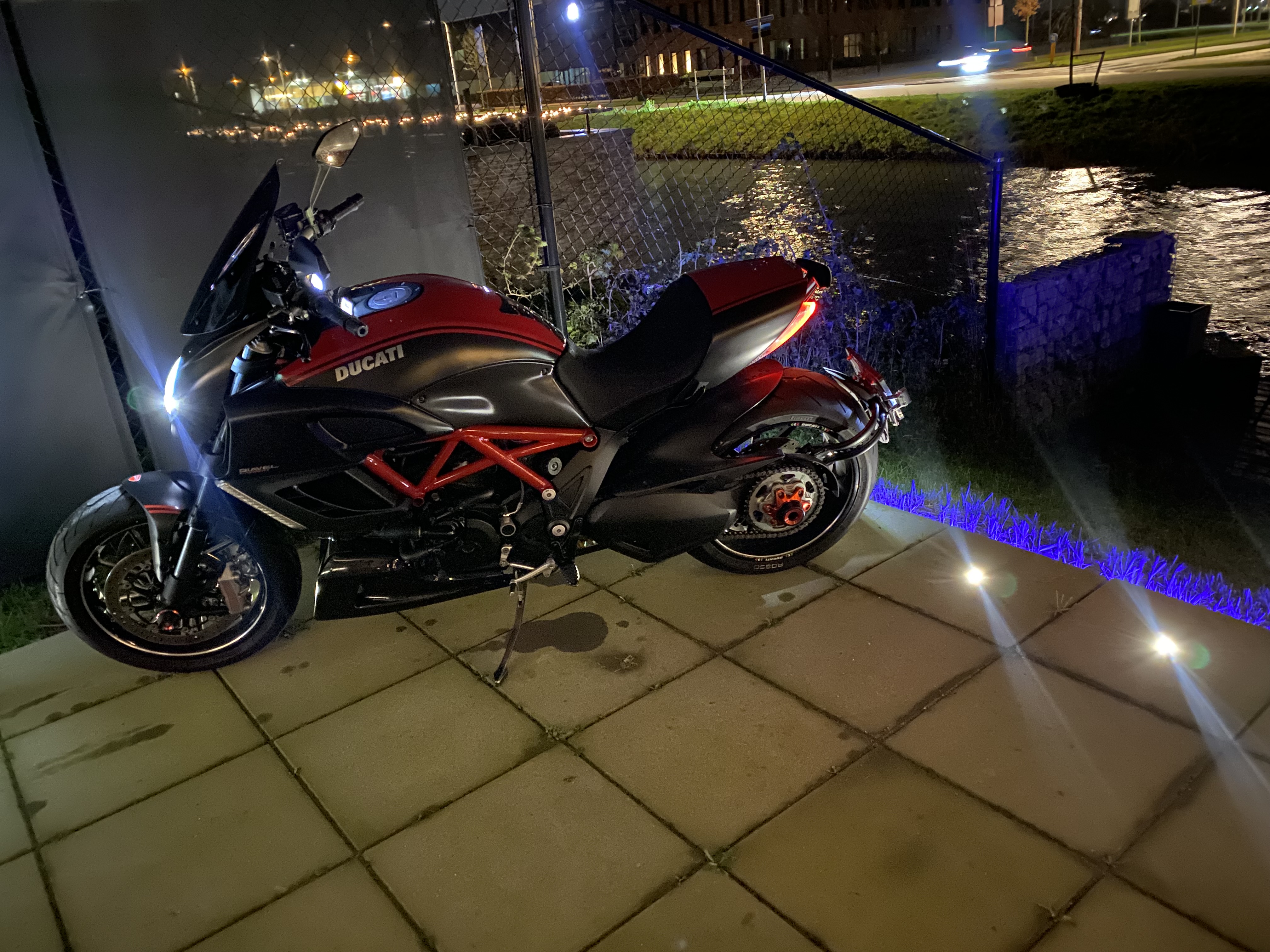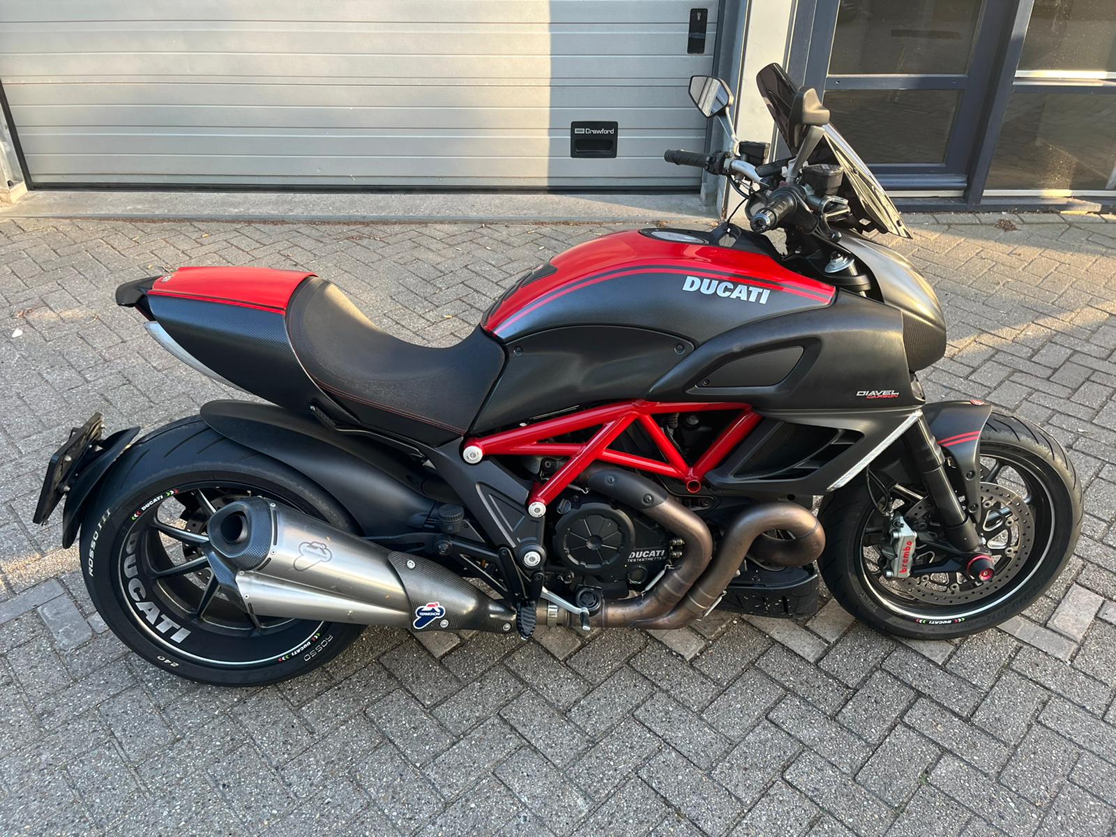 Ducatie Diavel performance Red Carbon editie origineel getuned door ducatie vanaf fabriek af in sport modus levert de motor 200 plus pk er zit een telefoon lader en houder op met extra wind scherm flammen uit de uitlaat veel extra opties ervaring vereist motor rijd zeer aangenaam in de laagste modus maar in de sport modus rijd hij als een supersport bike en is ervaring verreist